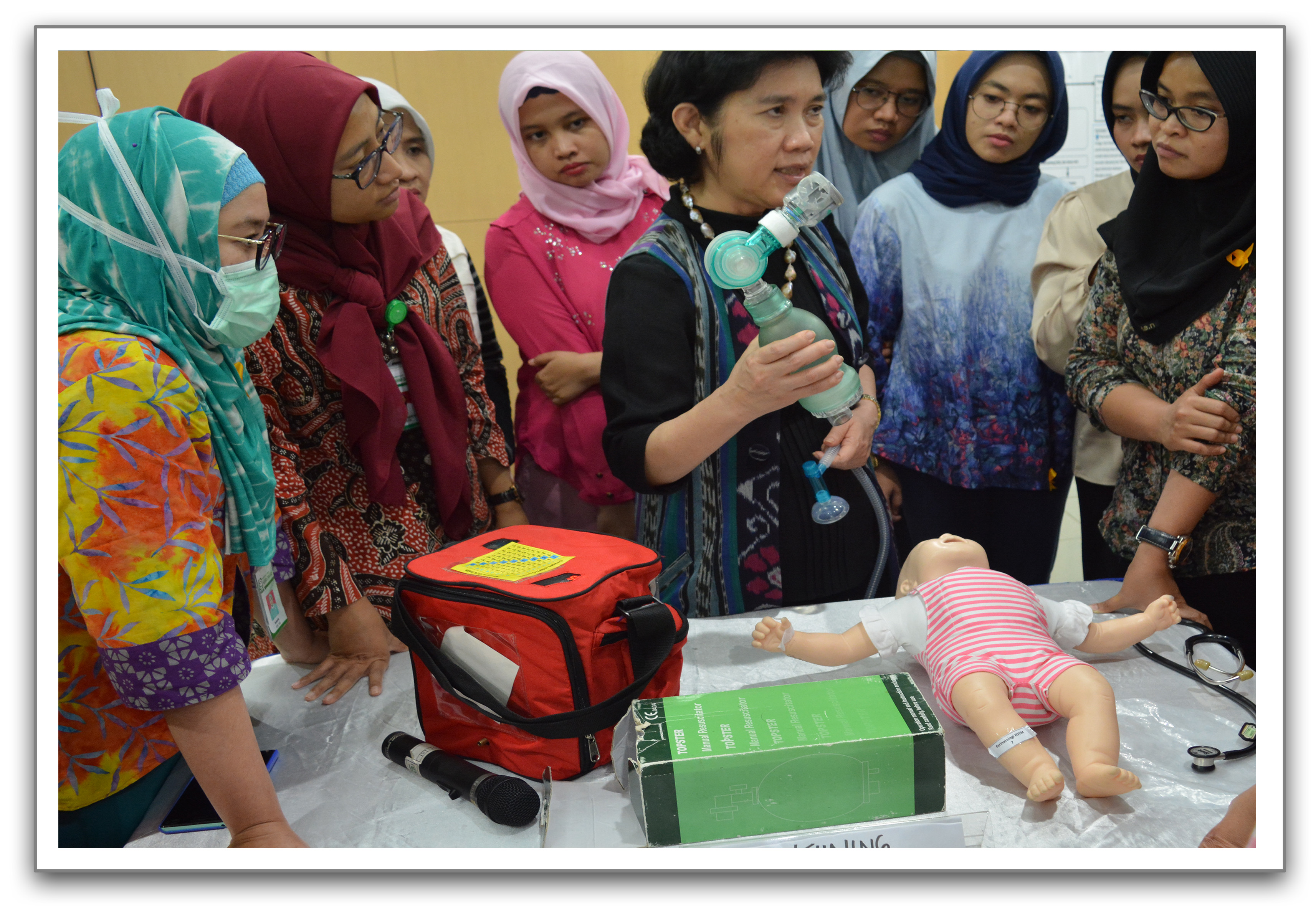 Susunan acara dalam pelatihan & workshop ini adalah pre test, ceramah, diskusi, tayangan kasus, post test dan praktik keterampilan penggunaan peralatan resusitasi untuk ventilasi tekanan positif.